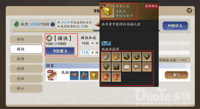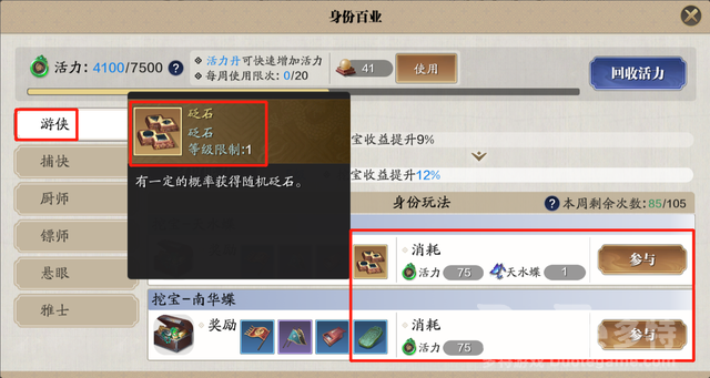 身份玩法中有两个能获得金色砭石,第一个就是当捕快缉拿,每次结算奖励的时候,有几率会获得金色的缉拿礼盒,开启后会得到金色砭石,不过是随机的,所以玩家们并不能确定是好是坏,能不能给自己用,只能看玩家们的运气如何了,第二方法就是当游侠挖宝,同样是有几率挖到金色砭石礼盒,打开随机拿到金色砭石,脸黑的玩家就非常难受了,有可能啥都弄不到,不过挖宝获得的几率比缉拿是要高的,所以玩家们要是不想去其它地方兑换金色砭石的话,就可以前往身份玩法碰碰运气,有不定运气好了,弄到一个自己能用的金色砭石,那就很赚了,即使没有自己可以用的,将这些金色砭石摆摊卖出去也能获得一个好价。