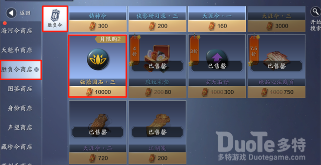 玩家能用一万枚胜负令,在商店当中换取圆形的金色砭石,但玩家们每周的上限也才只有一万,就等于换完之后,玩家就没胜负令换取其它资源了,所以个人建议和天魁币商店一样积攒,这样的话同样能满足玩家们的需求,但玩家们需要注意的是,千万被在胜负令商店中,买铸神令和侠影研习录,性价比非常低,容量浪费胜负令,可以多买一些琅纹礼盒和心法残页,这样玩家们功力才会提升的更快。