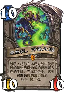 亚煞极,千首之神,这次作为污染之源降临。作为古神最强的它这次结合了新版本机制实至名归。众所周知,自从女巫森林之后新版本永远是新卡的天下,新卡拉满就对了,亚煞极能将已腐蚀的加强卡回手并且降至0费,再加上它不弱的身材,敢出我就敢带。