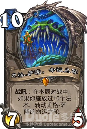 后是古神的重头戏,也是最能体现马戏团的卡:尤格萨隆。狗贼的玩物,翻盘的导演,傻龙带给了我们多少欢乐,好家伙,新版本傻龙玩的更开了,开始了抽奖模式,他会开启命运之轮