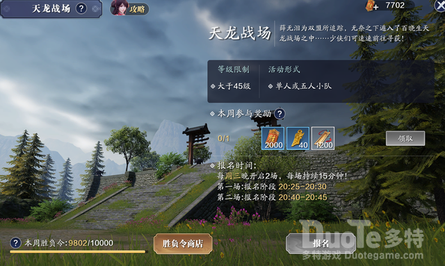 竞技里获取胜负令一共有四种方法其中一种是限时的也就是我们所说的战场,还有三种就是一对一论剑和5v5战场。