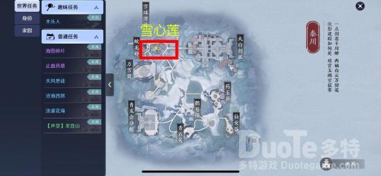 此处指的是秦川的蛟龙岭,传送过去就可以自动触发完成任务,在如图坐标就可以看到雪心莲进行采集。