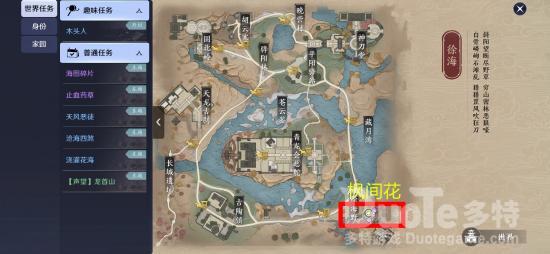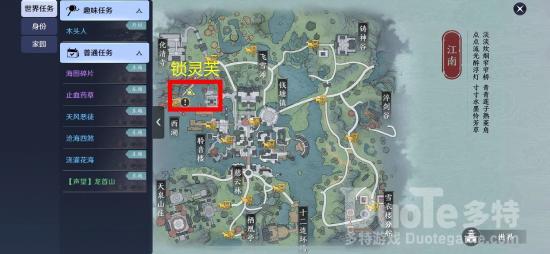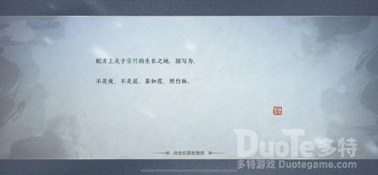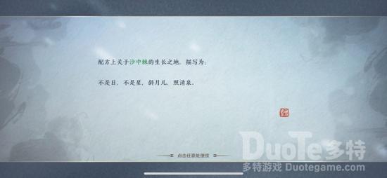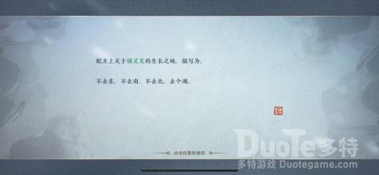 第一味:江南——锁灵芙锁灵芙生长于雨水丰沛之地,我们先自动寻路到江南,会出现“思索”的交互键,交互完成后会跳出一段动画,这段动画最终停留的地方,就是植物生长的地方的线索。除此之外,我们还能获得生长地方的文字线索。