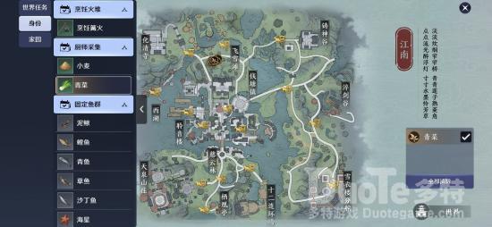 青菜可以在世界地图上通过厨师身份采集,如果背包里有青菜,就可直接在姑娘旁边的篝火做出水煮肉片,转交给姑娘就能得到枫间花的线索了。自动寻路就可采集,枫间花在如图坐标附近。