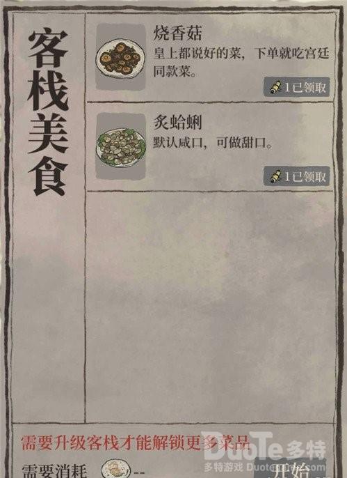 2、升级客栈。如果是新手玩家就会发现在解锁两个菜品之后就解锁不了菜品了,而是需要先升级客栈才能解锁更多的菜品,而升级二级客栈则需要十个好评空碟。