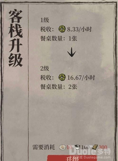 【升级客栈好处】1、升级客栈最直接的就是可以增加税收。从一开始的一小时8.33个铜钱到后来的一小时16.67铜钱等等,可以说是翻倍的增长,客栈也是一个赚铜钱很重要的来源。