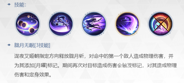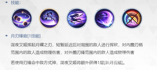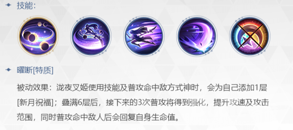 泷夜又姬使用技能及普攻命中敌方式神时,会为自己添加1层!新月祝幅];叠5层后,接下来的3次普攻将得到强化,提升攻速及攻击范围,同时普攻命中敌人后会回复自身生命值。