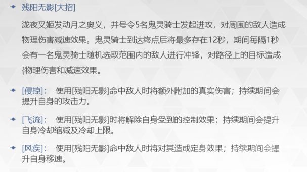 【侵掠】:使用【残阳无影】命中敌人时将额外附加的真实伤害;持续期间会提升自身的攻击力。