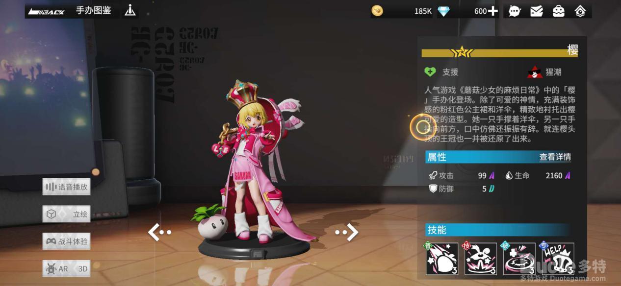 选择樱,是因为她的每次普攻都能附加给最低血量的手办进行治疗的效果。这样就可以让优纪一直保持开盾技能的状态,进一步提升优纪的强度。同时,樱的支援能力是增加队友的攻击力,可以保障更强力的输出效果。