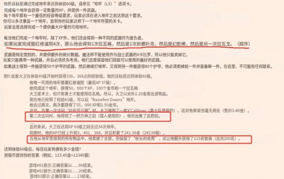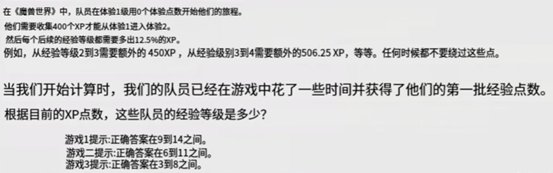 这些表格总共会分为七个难度(L1到L7),在每一张要处理的表格前,都会给出要计算的问题,答对即可获得积分,答错即当前的整张表直接报废,在完成全部试题后就会进入下一级难度,L1难度下问题都还算是比较简单,比如选手们只需要计算他们所“操控”的角色需要多少经验才能升一级,做任务获得的经验具体能让角色升到多少级等。