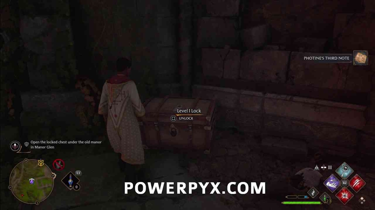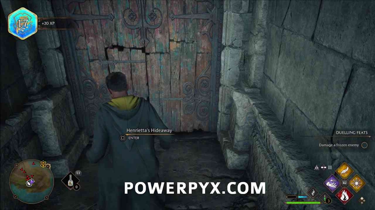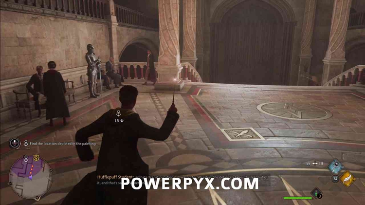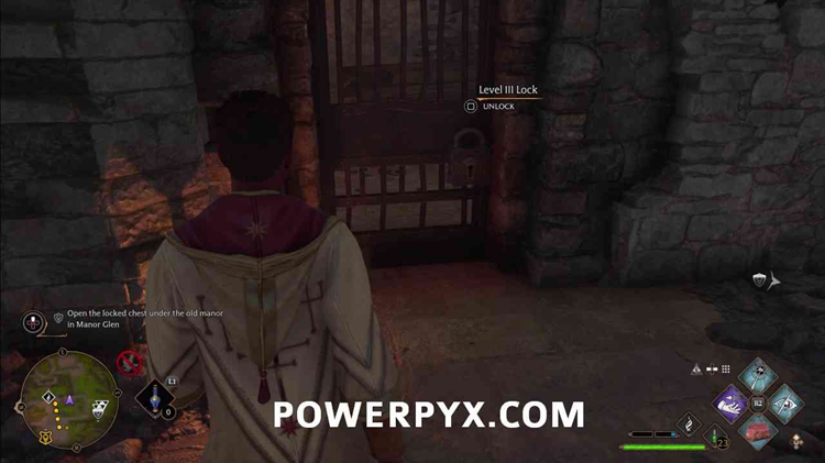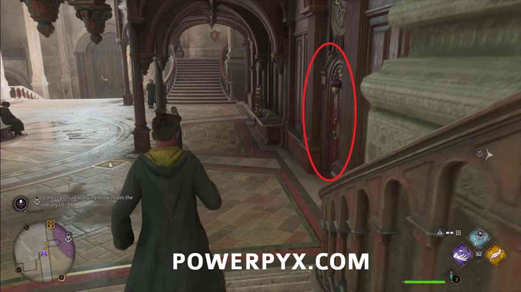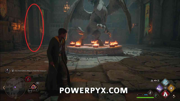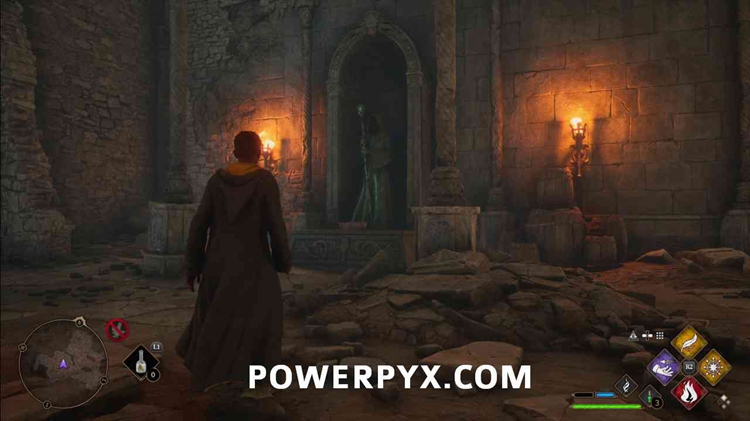 进入后右转下楼,通过上锁的门进入地下。它有一个3级锁,所以你需要先使用Alohomora3级法术,从收集22个半伪装雕像中解锁。