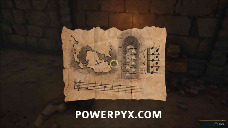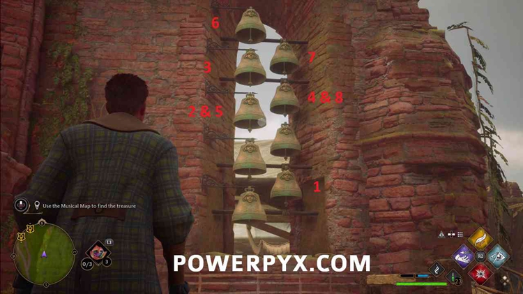 击败这座城堡中的所有敌人,然后寻找城堡内的钟声。按以下顺序用 / :RT: 敲:r2:响铃铛以继续。