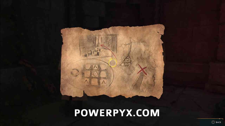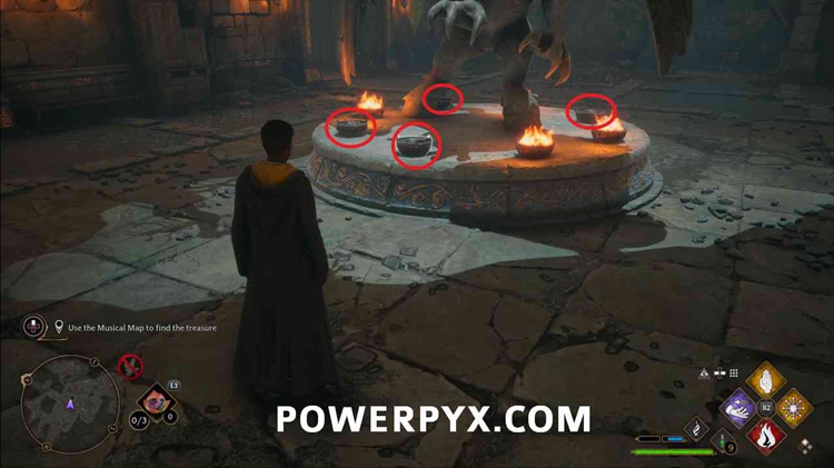 击败隔壁房间的敌人,然后在房间中间的雕像上使用燃烧。然后从下图中转动 4 个突出显示的火焰。这是地图上的提示: