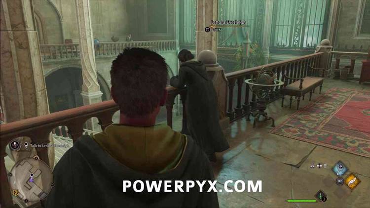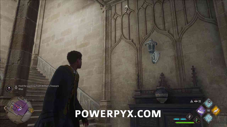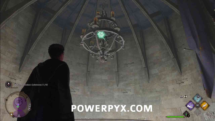拿起第一个高布石后,按照任务标记前往占卜教室。与其爬上通往教室的梯子,不如看看枝形吊灯,然后再次使用Accio。