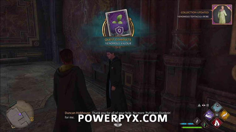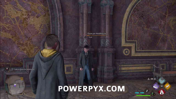 在黑魔法防御艺术塔的一楼与邓肯交谈。