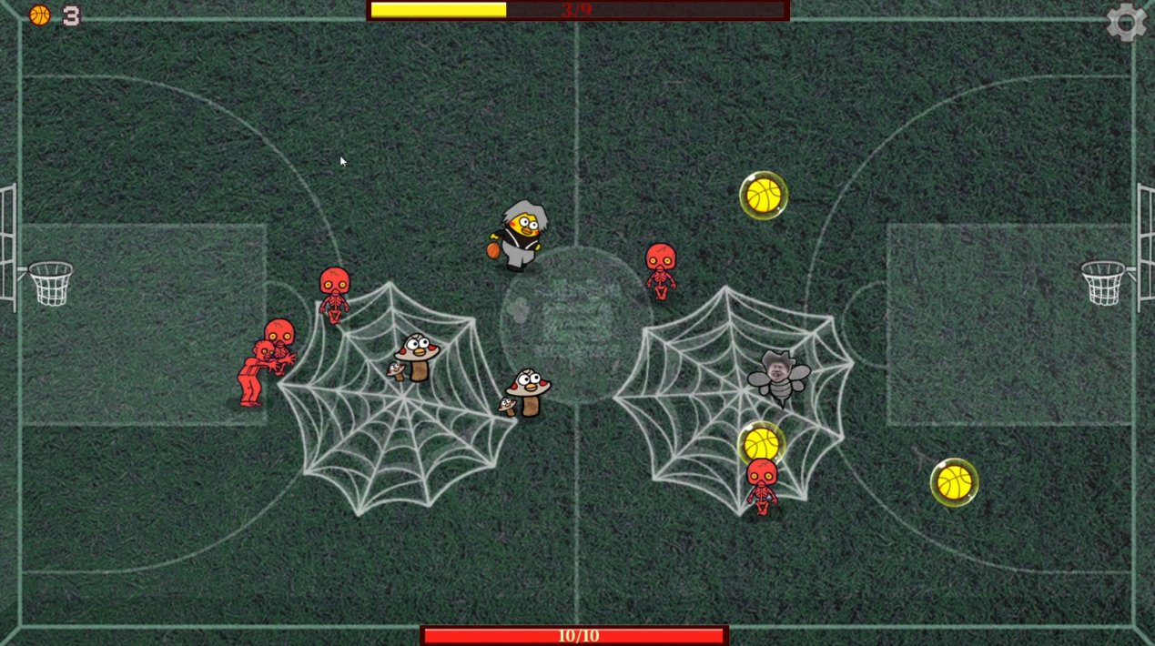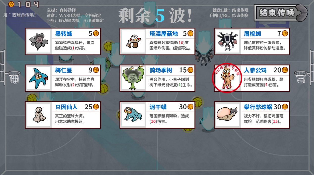 真要说新奇,那还得是游戏的另外两个彩蛋玩法,一个是“开团”,一个是“填空“。开团模式就类似于吸血鬼幸存者的玩法,每轮都要投够足够数量的篮球,这些篮球可以为我们提供更大的火力支援,不同的地图所能购买的道具也是不同的,虽说没什么深度,但是作者能想到这一步也是相当不错了。