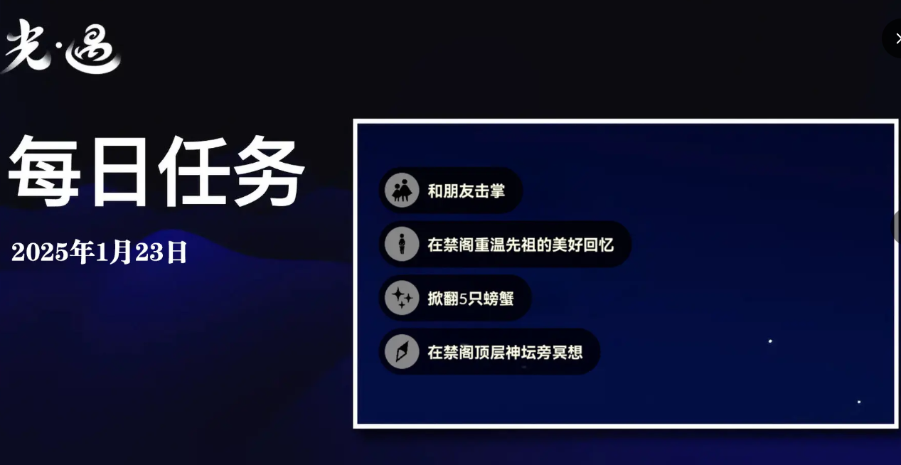 光遇今天的每日任务刷新在了禁阁,大家知道今天1月23日的具体任务信息和做法流程吗?下面为大家带来光遇1.23每日任务怎么做的具体内容和方法,感兴趣的玩家们千万不要错过哦!