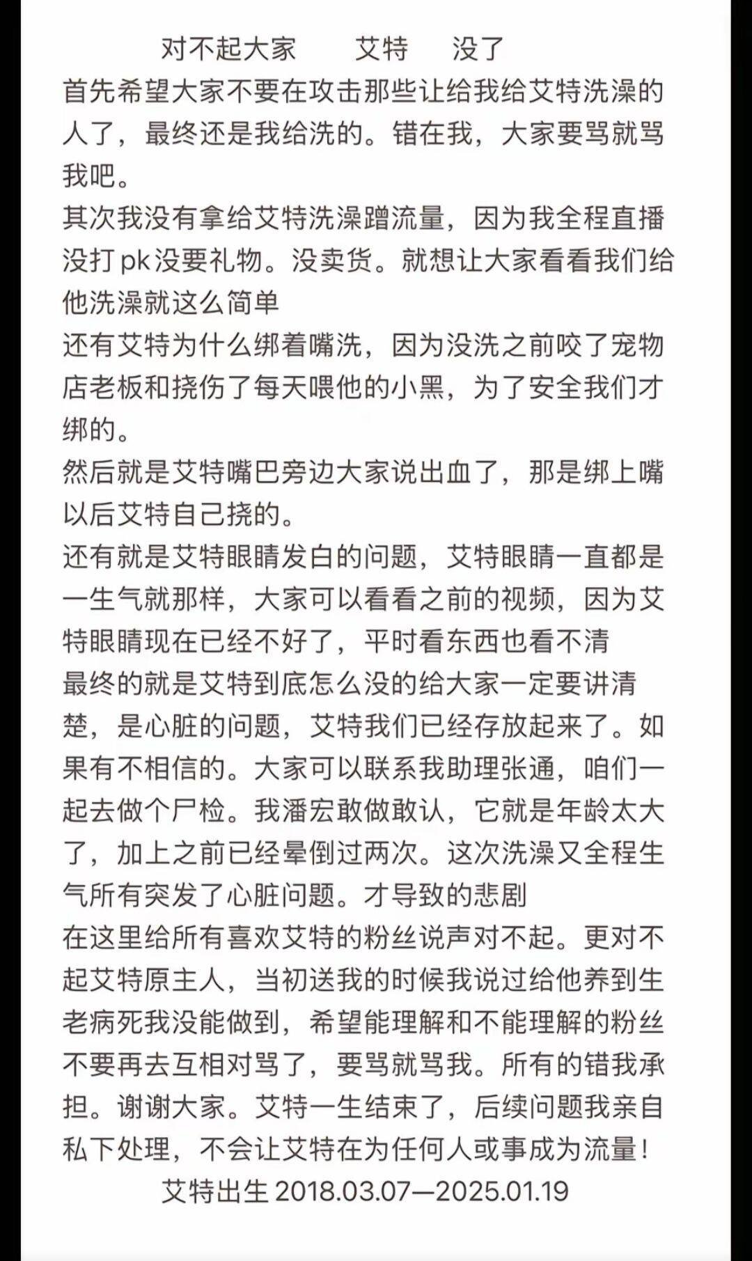 之后潘宏发表了道歉声明,表示艾特确实去世了,但是是因为年龄太大的心脏问题,也解释了为什么要绑嘴,因为之前艾特确实有过在洗澡时咬伤他人的记录,以及为什么没有观察到艾特情况不对(翻白眼),因为艾特一生气就喜欢翻白眼,当时以为是艾特生气了,没想到是不舒服。