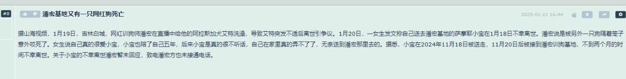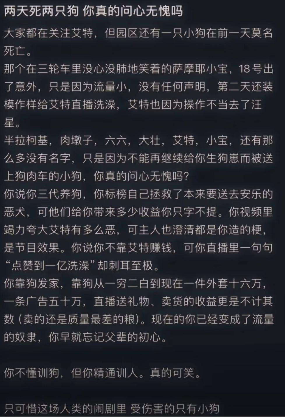 而且最近不止艾特,其他死亡的狗子也被爆了出来,比如曾经有一只名为小宝的萨摩耶,也在潘宏园区不到两月就死亡了。