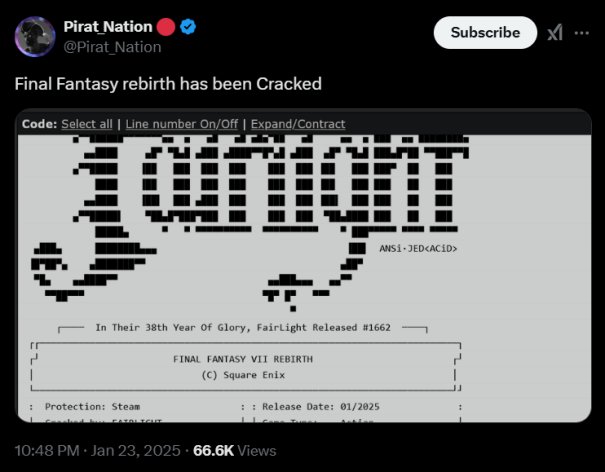 发售一个小时就光速破解?就在昨晚,《最终幻想7:重生》登陆Steam平台,2月6日前打7折,国区标准版312元。让人绷不住的是,有博主@Pirat_Nation直接发推表示,由于没有添加D加密,本作发售不到一个小时就被破解了!