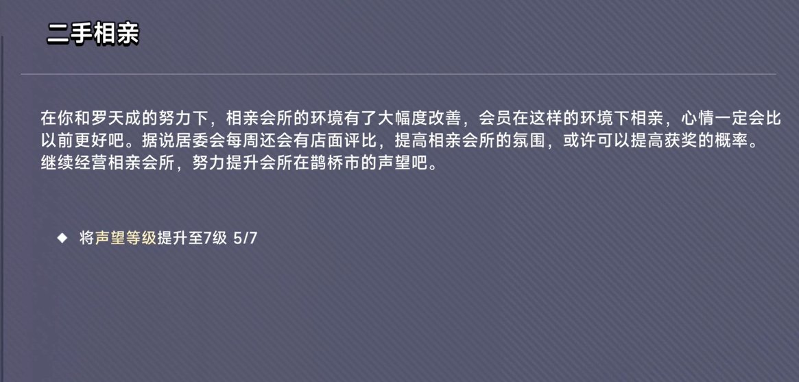 基本上就是在重复:“逛街—发现可说服NPC—乱点输出—配对”以上过程;所以游戏到了中期,我就完全失去了经营婚介所的欲望,只想推感情线。但感情线推到一定程度,对主线进程也有要求,这就导致我必须回来“坐牢”。而且主线也有刻意拖时长的地方,比如卡声望等级。