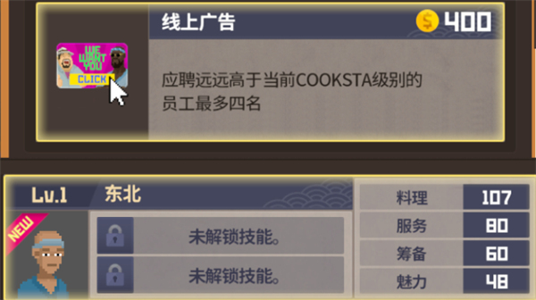 游戏开始时,可以招募四个店员。确保留足够的金币(4000)来进行招募。初期建议选择的店员包括: