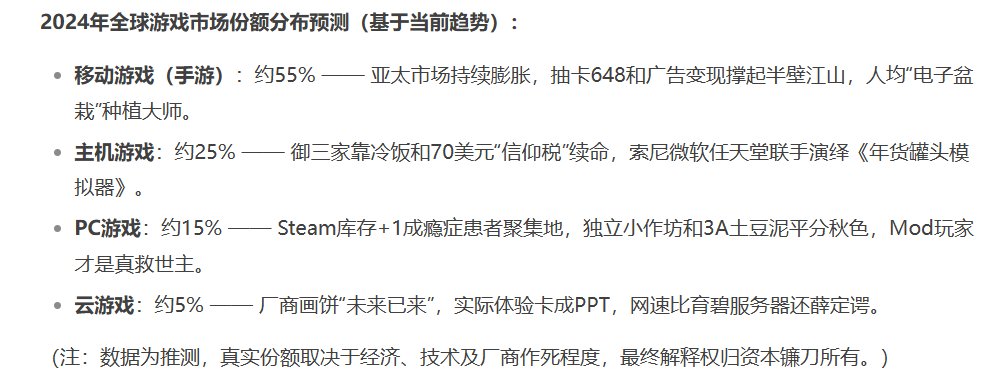 对了,郑重声明啊!以上均为DS观点,不代表本人观点!在最后,我问了DS一个非常正常的问题,“2024年游戏市场份额分布”想验证下他的数据整理能力,但没想到可能是被我训出来了,这么正经一个问题他最后都给我回答的阴阳怪气。