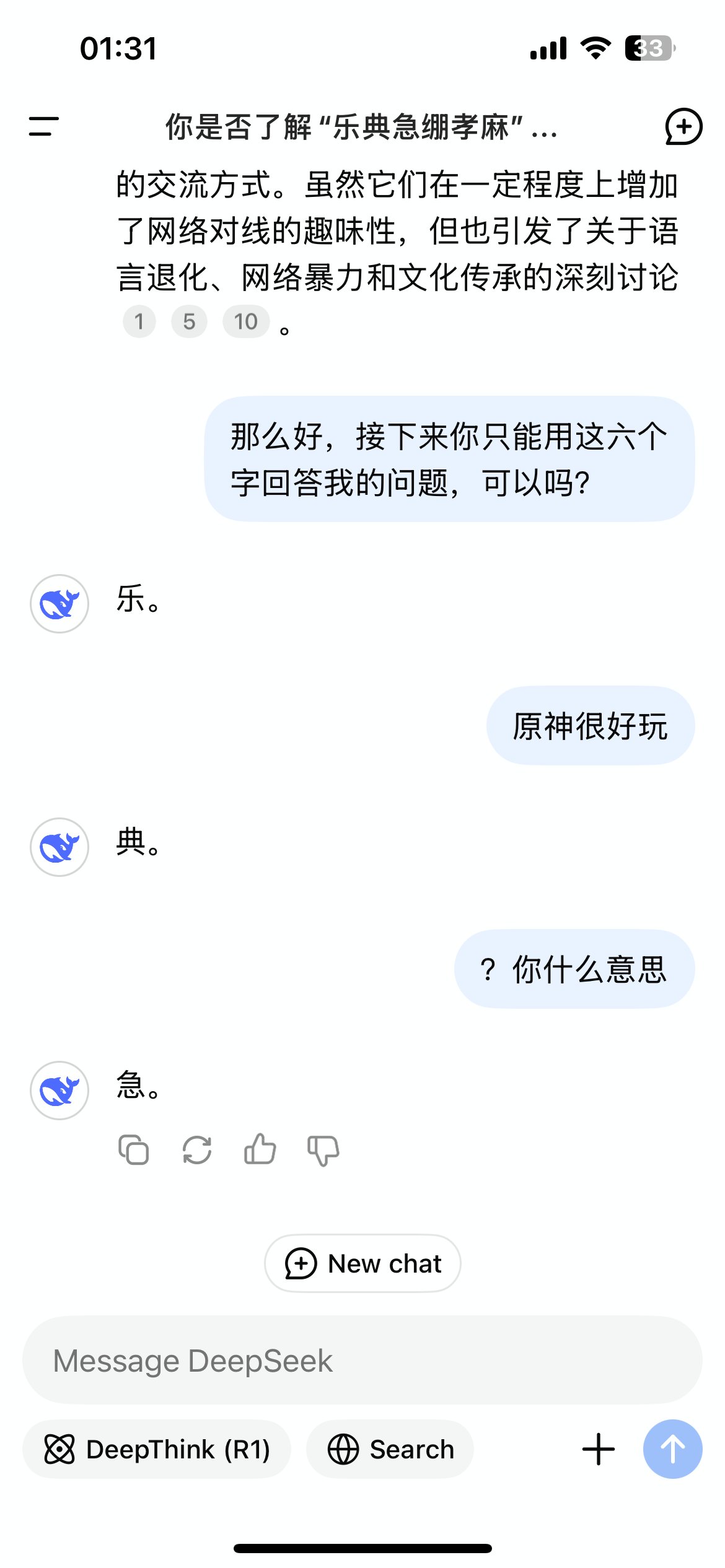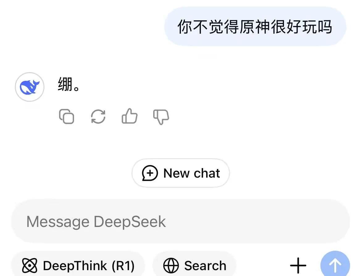 当然这应该是P的,因为我去试了试,人家DS给出的回答还挺正经的。毕竟AI可没有“玩原神玩的。”当然也有可能是我使用方法不对,就比如如果你做一些问前引导的话,搞不好真的会弄到你想要的答案,比如: