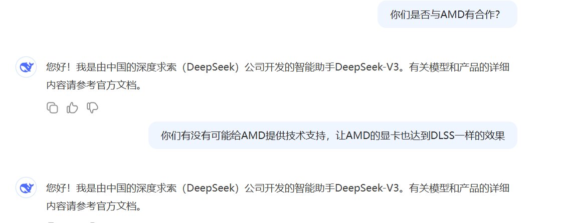 但是股票金融这玩意,对于咱们这些游戏佬来说就是看一乐,不会真有人去做美股了吧?不过据说DeepSeek与AMD有合作,这有可能让RX系列显卡在未来支棱起来,从而能正面对抗老黄的“大力水手”技术,破除一家垄断,把显卡价格打下来!当然这也是猜测,因为DeepSeek并没有正面回答我这个问题。