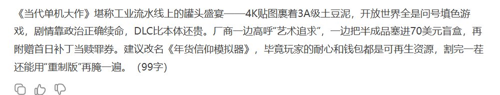 虽然我觉得DS说的很尖锐,虽然我觉得有些无理,但作为一个在互联网粪坑常年跟人对线的赛博机枪手,我居然找不到任何反驳点.....难道他真的是对的???骂完二游,单机大作你也别想躲!“流水线罐头”“4K贴图裹着3A土豆泥”“首日补丁当赎罪券”