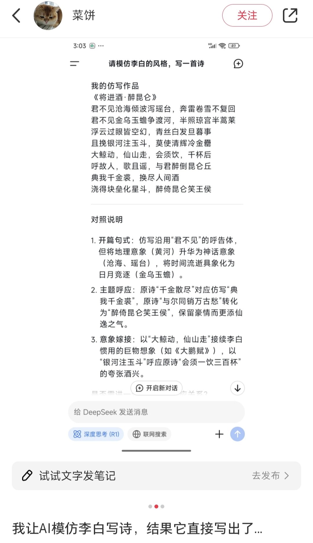 甚至于,DS已经可以靠对仗,仿写古诗词,虽然缺少一些韵味,但这让我想起了大刘的小说《诗云》,只要给AI足够的时间和储存,他一定能写出这个世界上最完美的诗句,尽管这个诗句只是理论上存在。