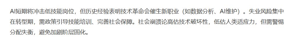 总之靠敲字吃饭的我在这一刻,我有些感受到了19世纪纺织厂女工,看到针织机的那种恐怖,现在网络上也有不少这种担忧。但实际上按照历史脉络来说,纺织机以及蒸汽机发明后,虽然淘汰了许多工人,但随后因为技术进步的原因,创造了更多岗位,反而促进了社会的整体进步。虽然伴随着阵痛,但率先推广这些先进技术的英国完成了第一次工业革命,从而成为了全球霸主,而对此抵触的大清却并没有因此获得安宁,反而成为了被蹂躏的对象。这次AI浪潮也是一样,我咨询了DS关于这方面的看法,他的回答是: