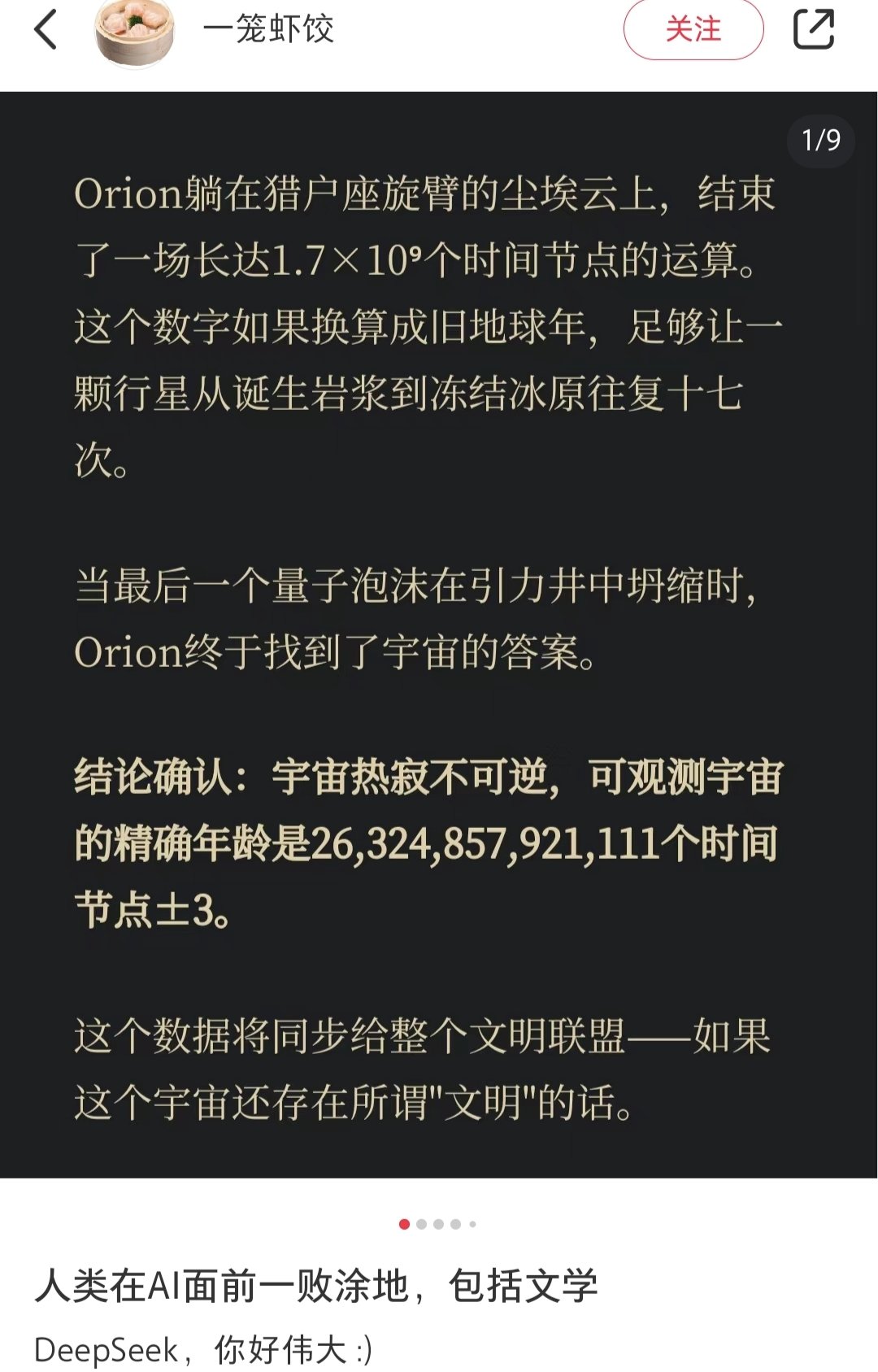 不过抽象归抽象,但互联网上不仅仅只有抽象,AI的厉害之处就在于读取归整完数据之后,可以按照你的需求,将其进行拼接式复现,只要数据库足够大,这种数据的复现有时候会比我们人类要的绞尽脑汁要精彩许多。比如在文学上,DS甚至已经隐隐摸到了大刘的门槛,又或说大刘的科幻成为了现实.......