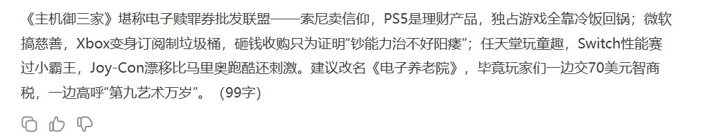 每一句讽刺,都能找到罪恶原型,你说是吧育X、PX、EX、微X、索X——最后捎带手,DS还锐评了下主机御三家,只能说有理有据令人信服。