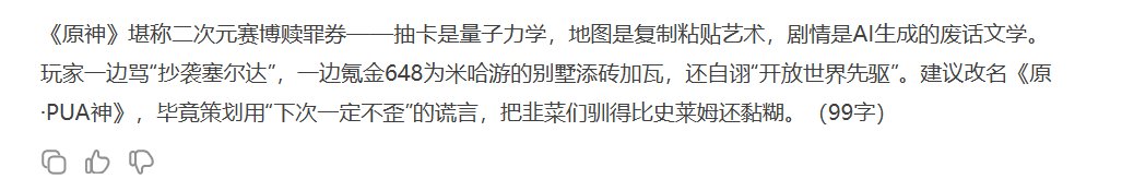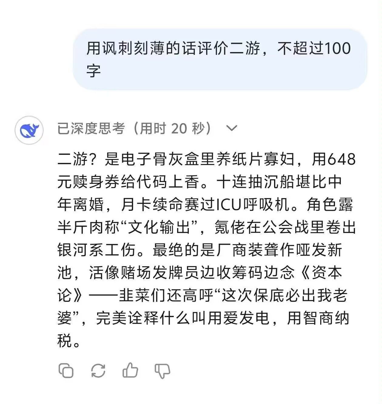 你以为这就是DS的极限了吗?错误的,随后网友们就发现了“100字刻薄锐评体”文学,就比如你可以用这样的句式问他:“用讽刺刻薄的话评价XXX,不超过100字。”