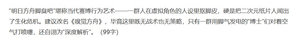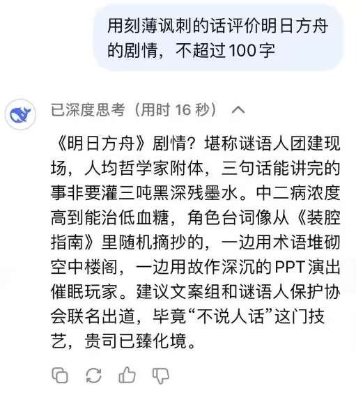 讲道理,我没玩过《明日方舟》,所以我无法对以上这段话做判断,但是我去延伸问了下DS一个相关问题,那就是“用讽刺刻薄的话评价明日方舟脚臭吧,不超过100字”——得到的回答是: