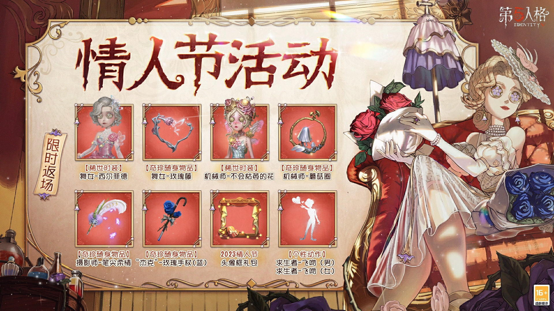 【稀世时装】舞女-西尔菲德、【奇珍随身物品】舞女-玫瑰藤、【稀世时装】机械师-不会枯萎的花、【奇珍随身物品】机械师-蘑菇圈、【奇珍随身物品】摄影师-笔尖柔情、【奇珍随身物品】“杰克”-玫瑰手杖(蓝)、2023情人节头像框礼包和【个性动作】求生者-飞吻限时返场上架商城。