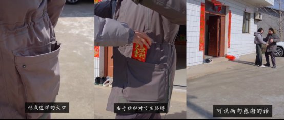 我刷到这个博主的时候正好不是过年期间嘛,他也是与时俱进连串亲戚送礼、收红包、装车回程这样年味十足的教程都做了一遍,就比如这个收红包教程,衣服口袋该做怎样的提前准备,收红包时欲擒故纵的姿势该如何摆放,到手后该做出什么样的回应,这套流程对中国人来说明明早已滚瓜烂熟,但潜意识里还是想把它看完。
