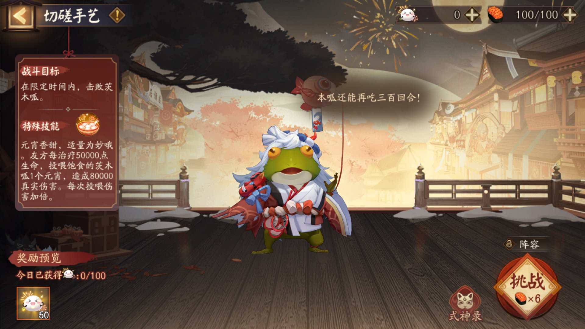 ※切磋手艺:大人们消耗「体力」在限定时间内打败茨木呱则挑战成功,获得「喜乐元宵」。