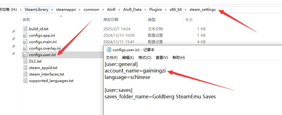 浮空岛改名字教程:记事本方式打开\Aloft_Data\Plugins\x86_64\steam_settings\configs.user.ini,找到account_name=gaimignzi,把gaimignzi改成自己想要的名字。