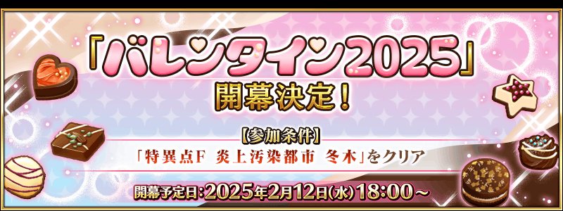 在限时活动的“情人节2025年”中,您将能够向所有在2025年2月9日星期日出现的从者提供巧克力,其中包括一名新从者。