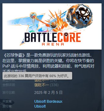 育碧新游上线了我咋不知道?育碧开发的免费6v6射击游戏《芯球争霸(BattleCore Arena)》现已登陆Steam平台,目前好评率66%褒贬不一。游戏的核心玩法简单概括,就是在物理滚球游戏的基础上,增加了竞技射击要素,但从评论区的反馈来看,现阶段的设计并没有什么乐趣。截至目前,本作在Steam平台的最高在线玩家数,仅为124人(去年测试的玩家数),当前游玩人数更是只有3人,连一局游戏都开不起来!好家伙,这还不如首发700人在线的《星鸣特攻》呢!