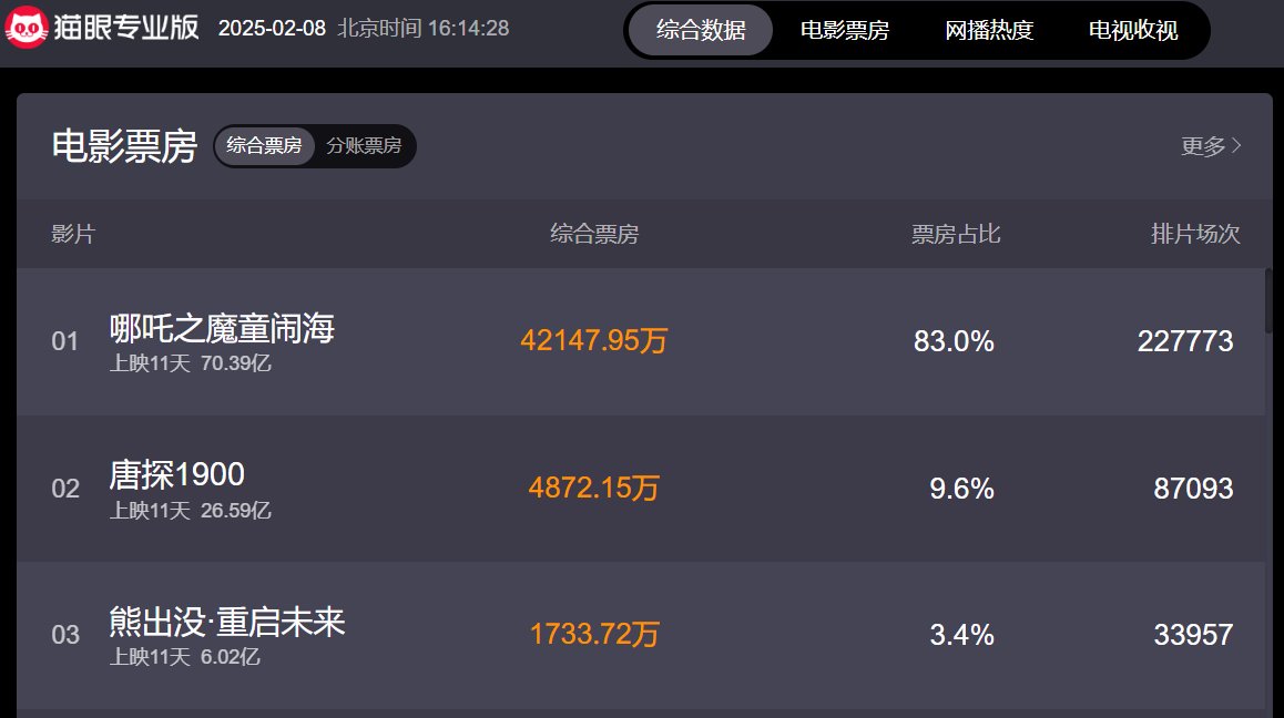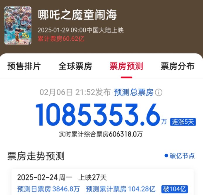 这个票房不仅仅破了国内票房记录,甚至还破了由《星球大战7》创造的单一市场最高票房记录(9.37亿美元)。更恐怖的是,目前《哪吒:魔童闹海》的预测票房已经达到了108亿人民币(约15亿美元),这是可以争夺全球票房年冠的成绩(但今年有《阿凡达3》所以希望其实不大)。