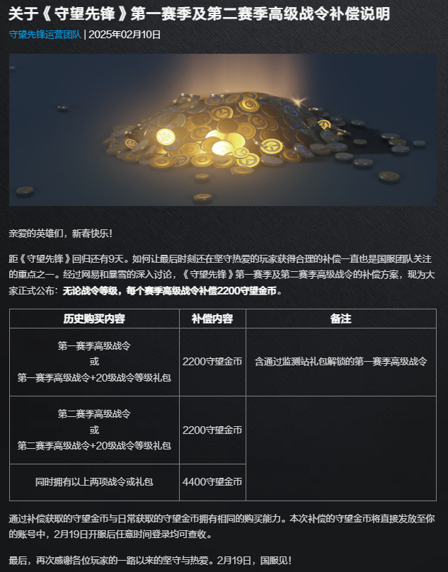无论战令等级,每个赛季高级战令补偿2200守望金币,补偿金币购买力与日常获取的金币相同,将直接发放至个人账号,2月19日国服回归后任意时间登录均可查收。