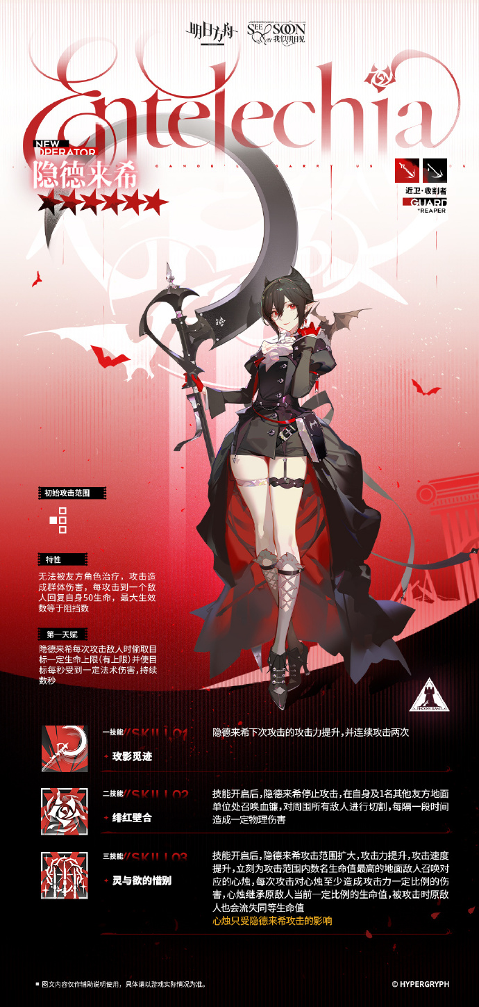 子职业收割者,特性自然是无法被友方角色治疗,攻击造成群体伤害,每攻击到一个敌人回复自身50生命,最大生效数等于阻挡数。