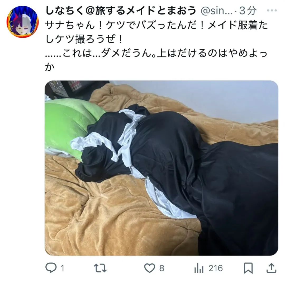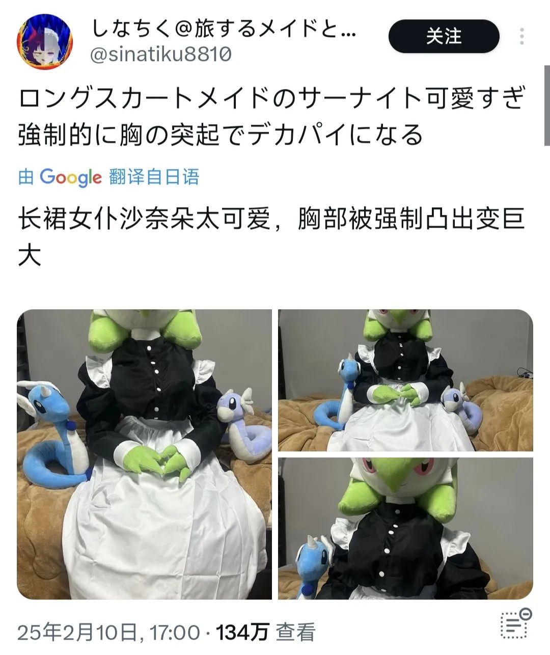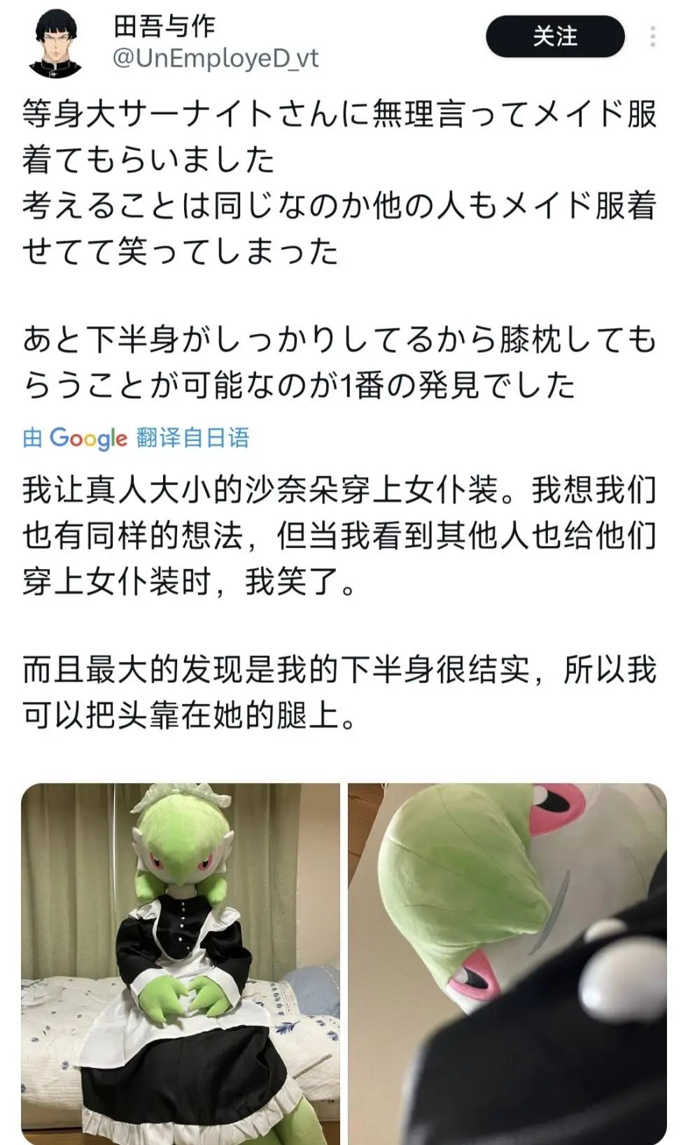 不止如此,他也让自己的沙奈朵玩起了Cosplya,就比如换上女仆装。但是这位博主的画风跟其他玩家的完全不同。其他玩家顶多是躺在自己的女仆沙奈朵的膝盖上感叹下。