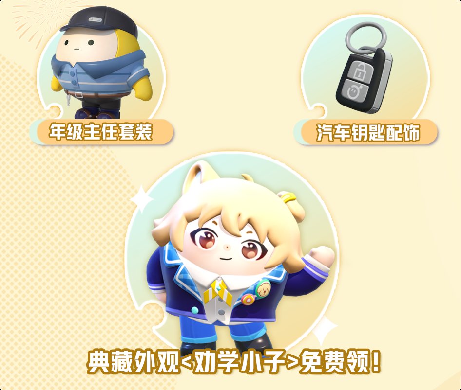 2月28日起,每周五—周日按时登录,即可免费抽取典藏外观<学小子>、套装<年级主任>、配饰<汽车钥匙>等奖励。
