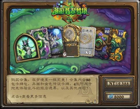 超级合集含构筑模式80翡翠包,10翡翠金包,异画护路者玛洛恩,1张随机翡翠金橙,德鲁伊新皮肤“伊瑟拉”及其卡背,售价4880奥术宝珠(国服)/8000符文石(外服)。