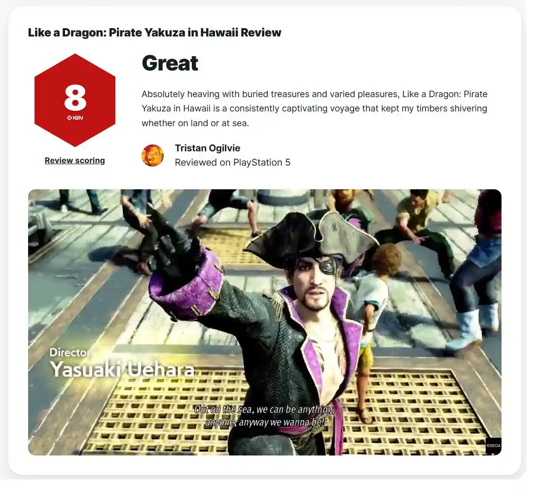 IT之家 2 月 19 日消息,世嘉动作冒险游戏《人中之龙 8 外传:夏威夷海盗》全球媒体评测现已解禁。截至IT之家发稿,游戏在 MetaCritic 上的评分情况为:PS5 版收获 65 篇评测均分 79,PC 版收获 18 家评测均分为 81,Xbox 版则是 7 篇评测给出 87 分。