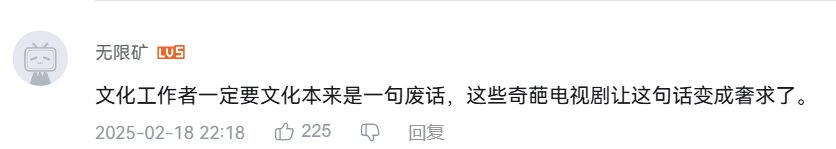 综上所述,我想你一定明白了这个电视剧的剧情到底离谱到了什么程度。这让我不禁感慨:“文化工作者一定要有文化!”——去年底我还在嘲讽这种句式的话是废话,但没想到回旋镖来得这么快,是我肤浅了。